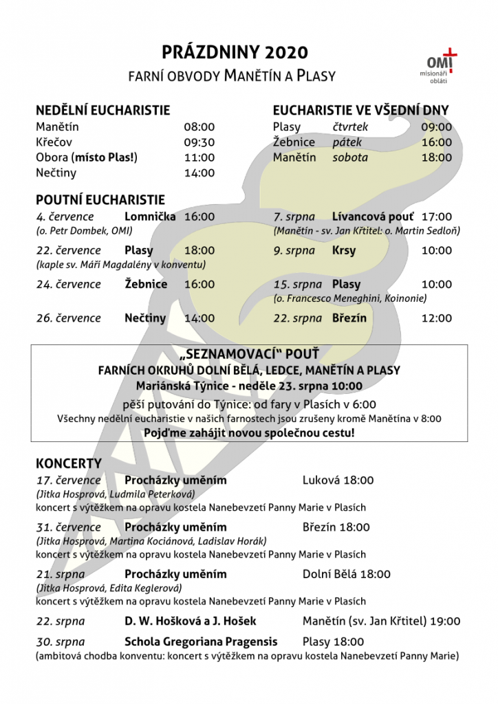 V příloze najdete prázdninový "rozpis" časů a míst slavení farních eucharistií a dalších akcí. Zvláštním způsobem vás chceme upozornit především na to, že "plaská" nedělní mše se bude po celé prázdniny slavit stále v Oboře, ale čas se vrací do období před pandemií, tedy na 11:00! Informace najdete samozřejmě i na webových stránkách farnosti.