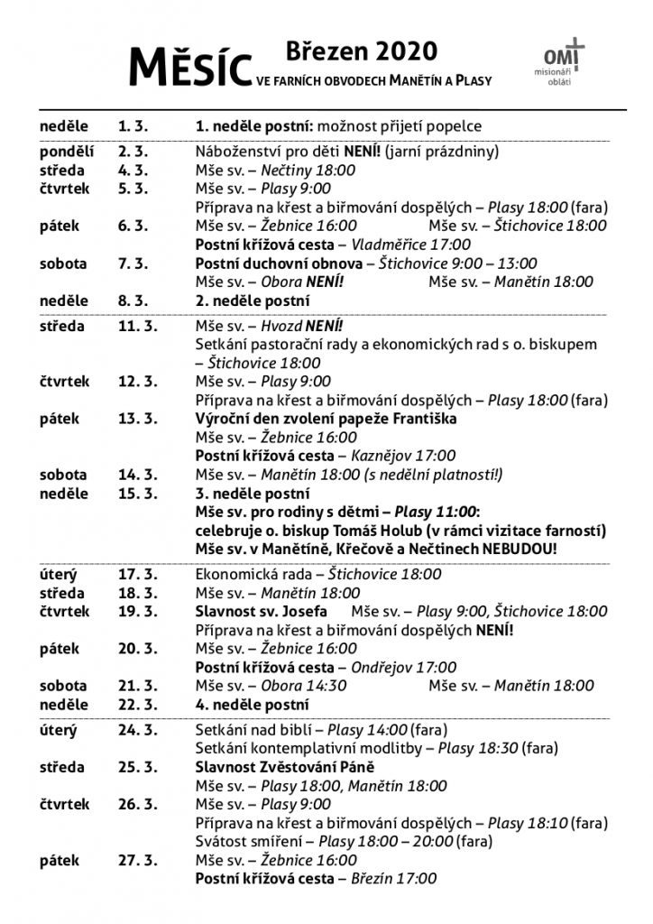 V novém měsíčním přehledu upozorňujeme zvláště na možnost venkovních křížových cest (vždy v 17 hod). Zveme také na postní duchovní obnovu 7. března do Štichovic (téma: Skutek (ne)utek!). Jako vrchol celého dění v tomto měsíci bude vizitační mše svatá s o. biskupem Tomášem a to 15. března v 11 hod v Plasích. Srdečně zveme!