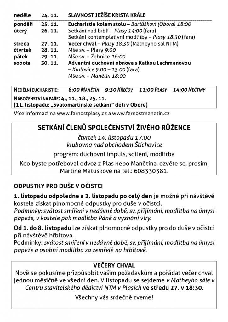 S listopadem tady máme modlitební dušičkové období, na které naváže 1. prosince advent, a tedy intenzivní příprava na Vánoce. Ale ještě předtím se v listopadu můžete těšit na setkání členů Společenství živého růžence, večer chval v Plasích a adventní duchovní obnovu v Kralovicích s Kateřinou Lachmanovou. Zveme také na mši svatou za oběti zneužívání v církvi! Sledujte aktuality na webu.