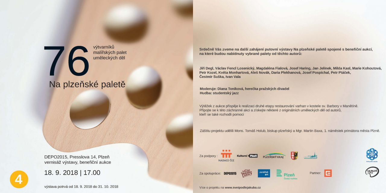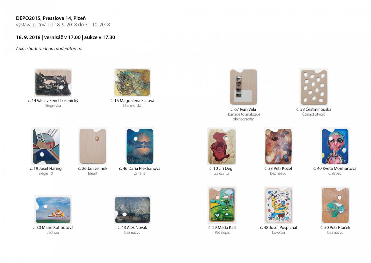Srdečně Vás zveme na další zahájení putovní výstavy Na plzeňské paletě spojené s benefiční aukcí, na které budou nabídnuty vybrané palety, které můžete vidět v přiloženém souboru.